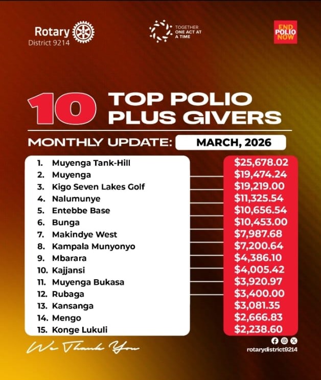 March 25, 2026 TOP POLIOPLUS GIVERS – MARCH 2026 Rotary Bunga News 0 Comment Spread the love Dear People of Action, here are the Top PolioPlus Givers for Rotary District 9214 as of – end of March 2026. Thank you very much for your generosity. A polio-free world is within reach and now is the time to stay the course. Google Tweet